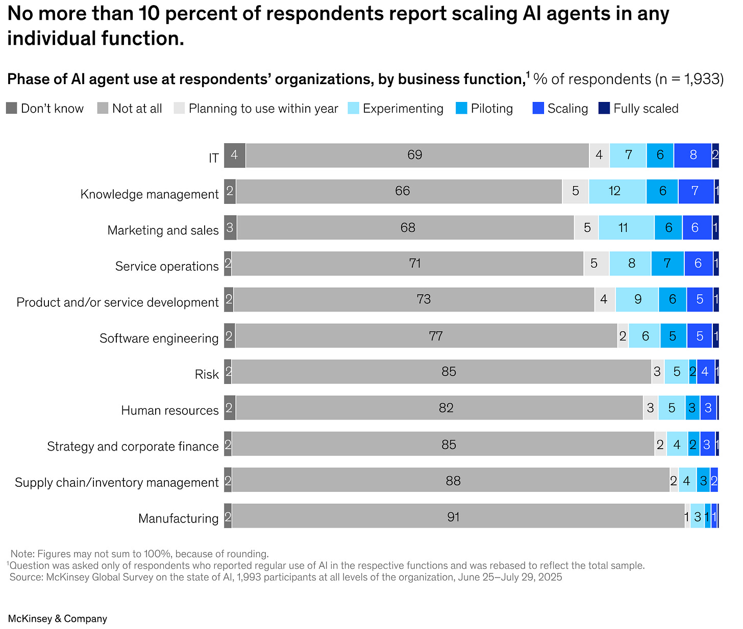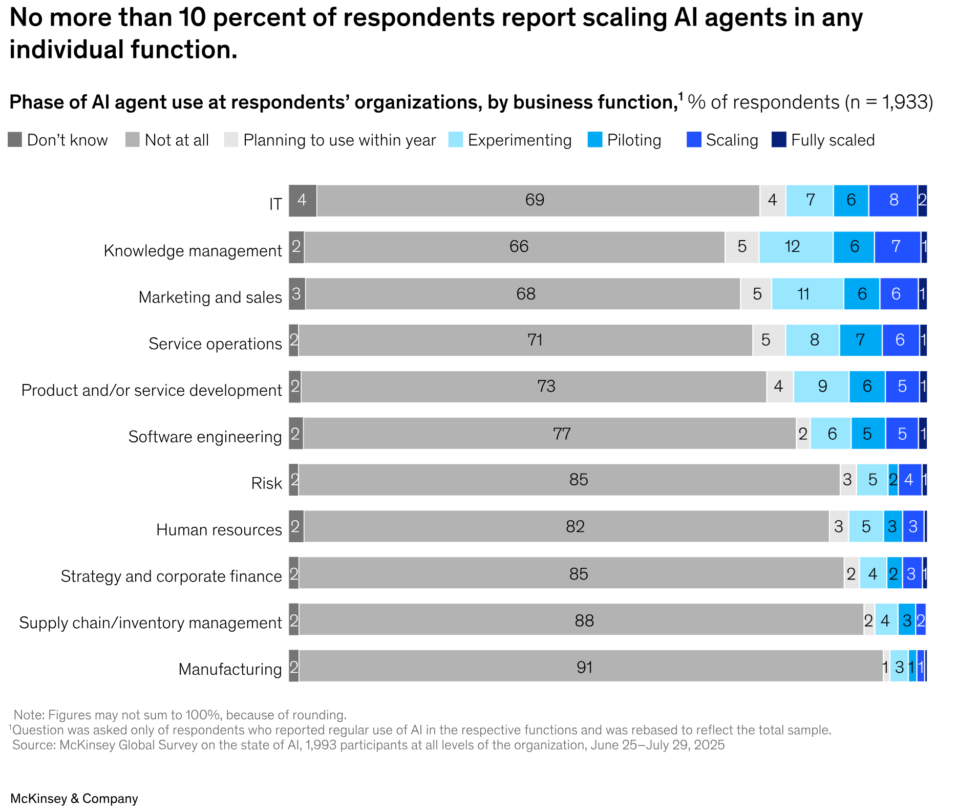 There’s a similar story for business users. When you look at the set of “1,001 AI use cases from Google Cloud customers,” it’s still mostly customer service agents and marketing content. Klarna, a fintech startup, made headlines in 2024 for announcing it was using AI agents to do the work of 700 customer service reps only to make headlines again in May 2025 for reversing course and moving back to human customer service, citing “lower quality” from AI agents. A recent McKinsey survey found that while many businesses are experimenting with AI agents, very few are deploying them at scale.